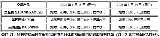 因应美国马丁路德金纪念日假期 (2021年1月18日周一), 以下产品的交易时间将于假期期间提早休市,敬请阁下留意知悉!