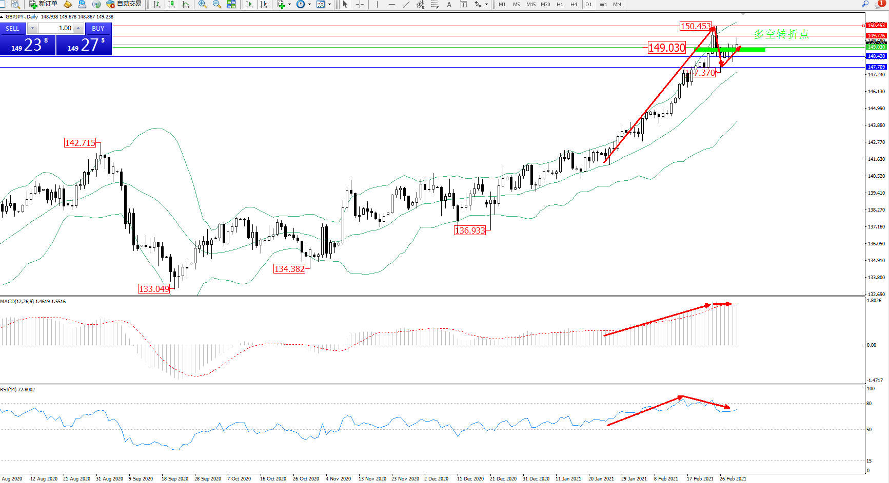 技术点评:多头动力延续布林带指标通道中上轨区间持续震荡上扬,高位抵达150.453附近节点遇阻回撤,纠结于中上轨区间弱势持续震荡拉升,多头动力有继续向上移动态势,布林带指标上行趋势通道不断向上移动中,MACD指标处于多头区域维持整理平移,RSI指标处于多头区域超买区80均衡线附近整理平移后开始短暂回调弱势徘徊;