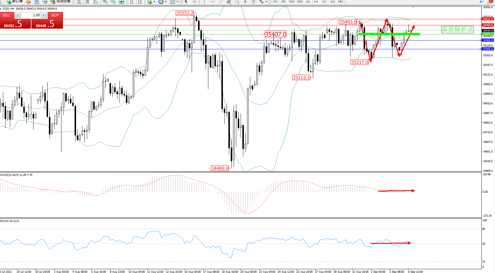 道琼斯指数DJ30——4小时K线图显示:
