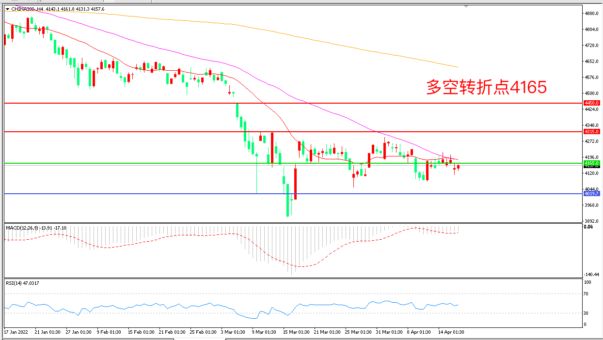 4小时图看,沪深300延续低位震荡,但整体仍受制于55周期均线,4165成为多空分水岭,MACD绿柱增加,RSI指标走平,日内震荡下行概率较大。