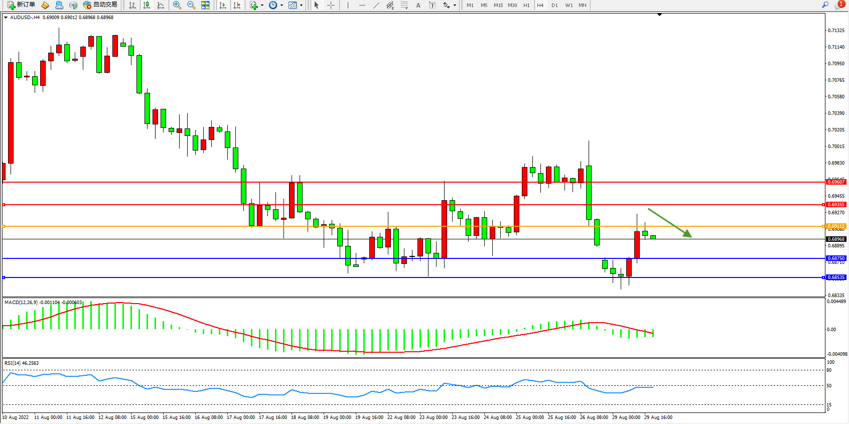 交易策略:0.69112下方看跌,目标0.68750、0.68535