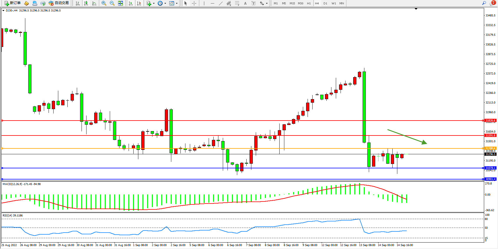 道琼斯指数DJ30——4小时K线图显示: