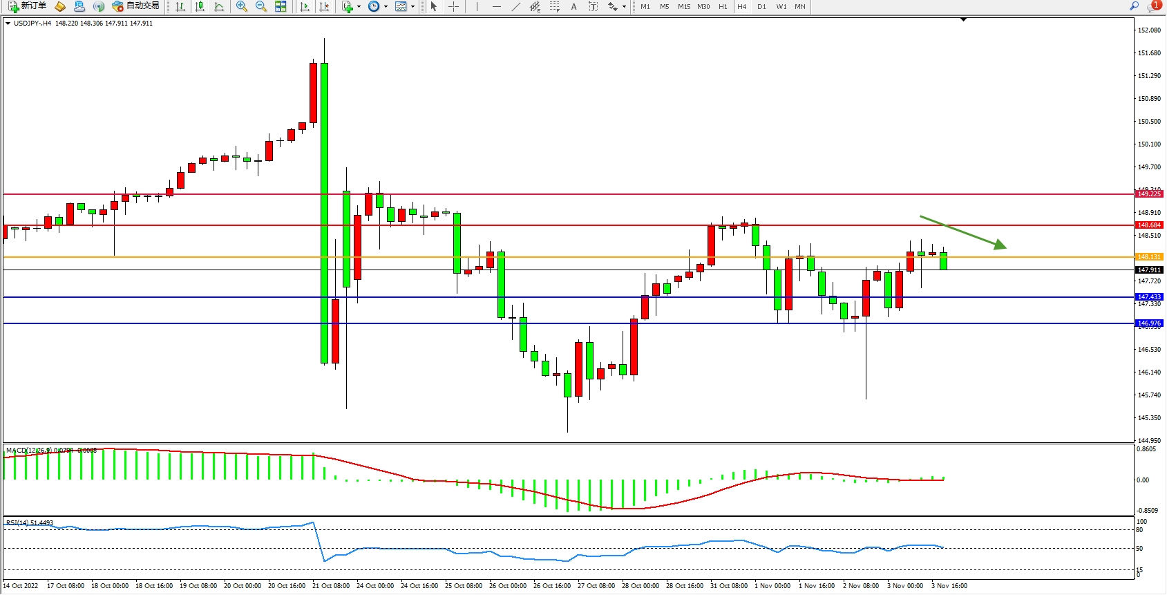 交易策略:148.131下方看跌,目标147.433、146.976