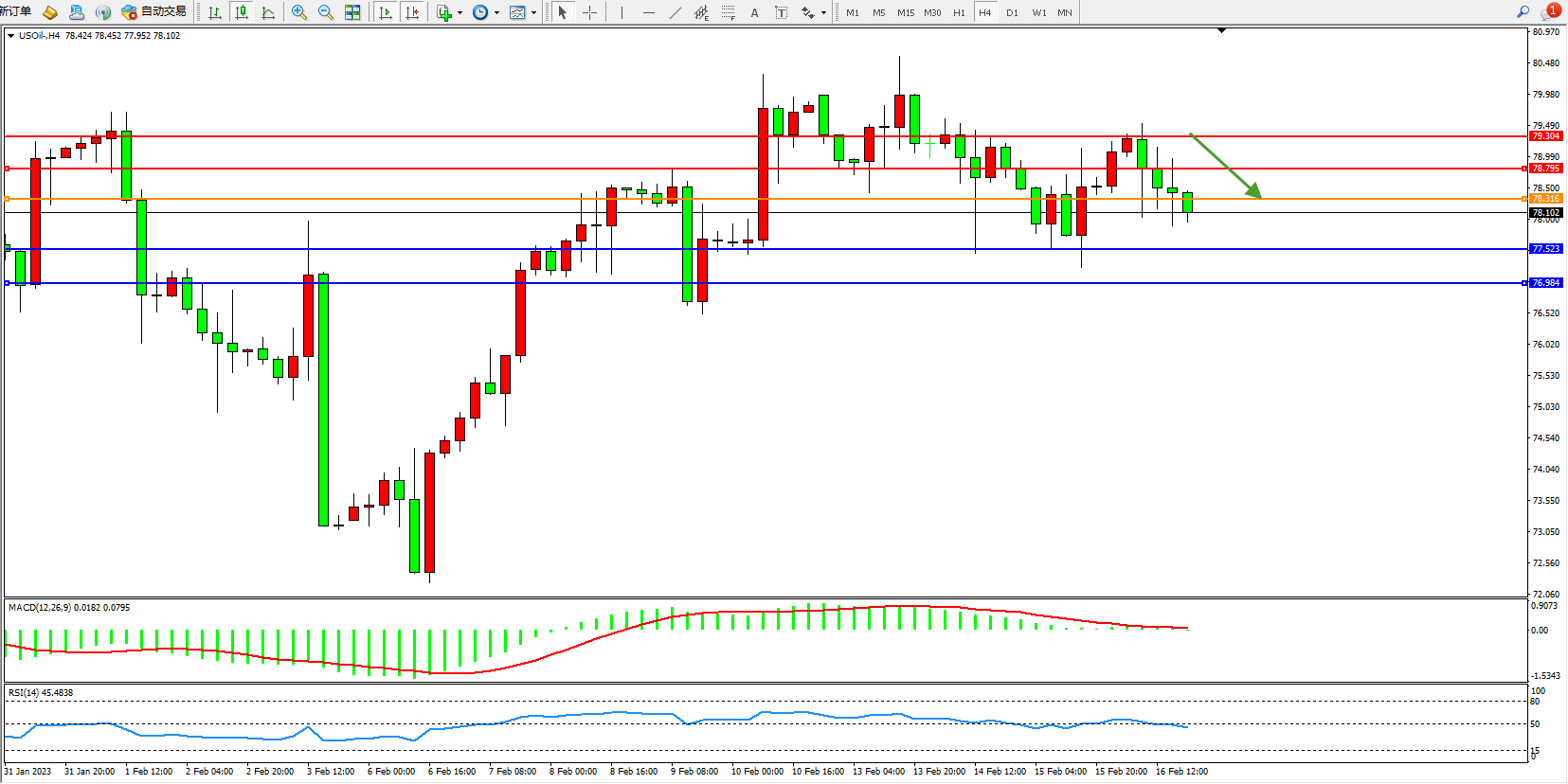 交易策略:78.316下方看跌,目标77.523、76.984