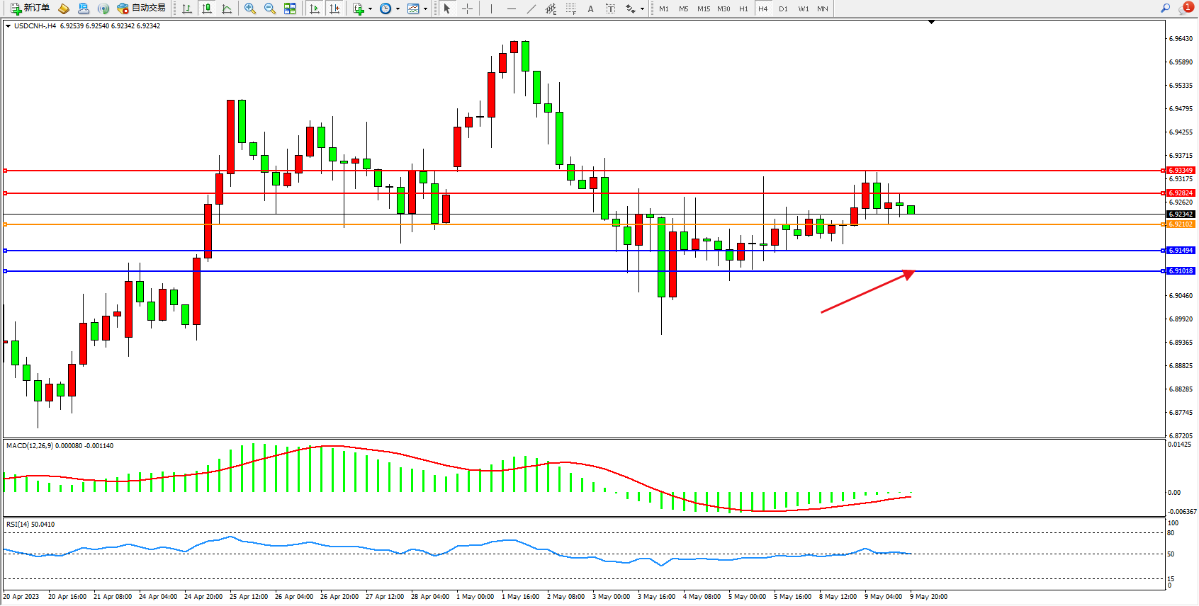 美元人民币USDCNH——4小时K线图显示: