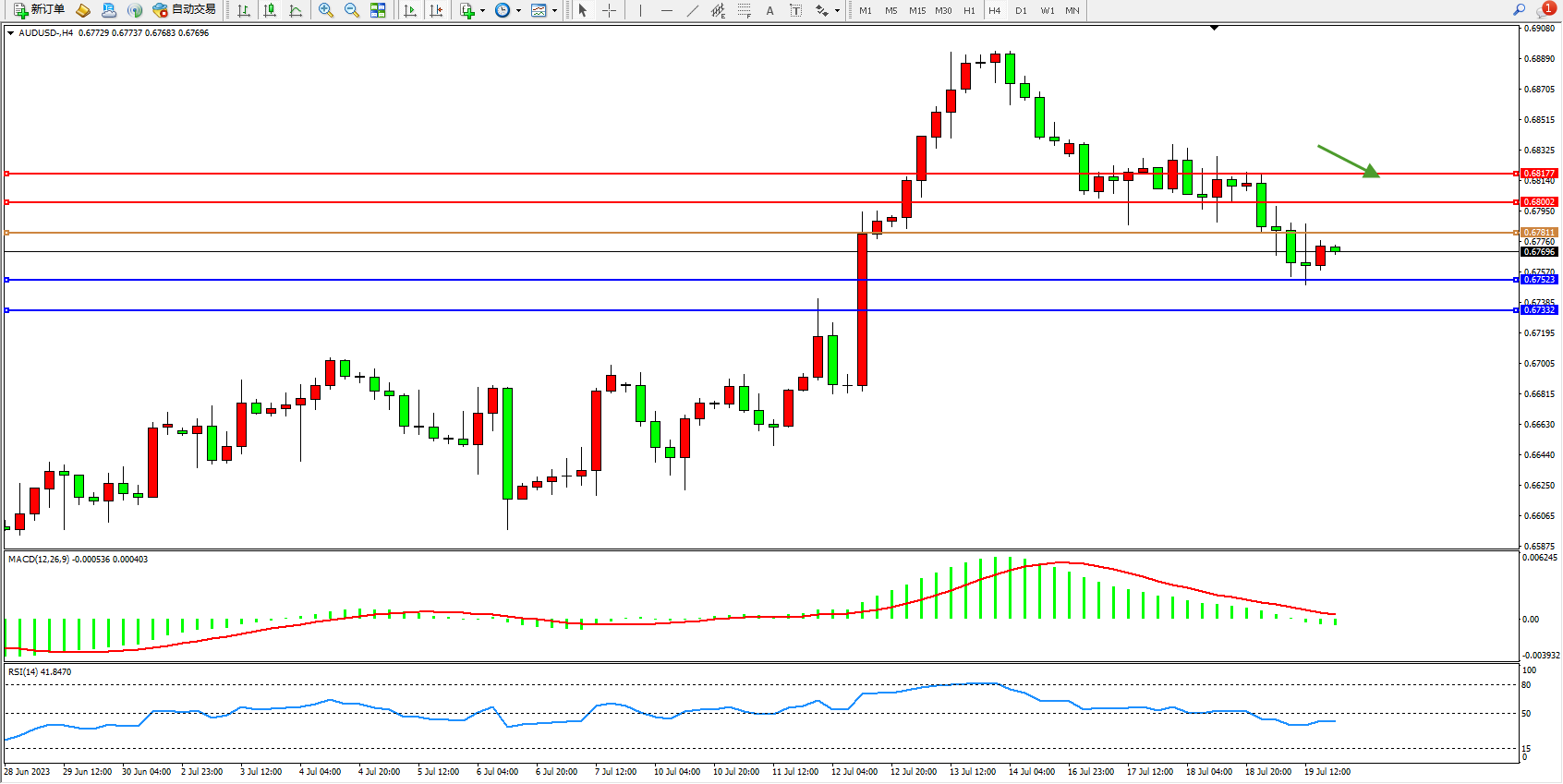 交易策略:0.67811下方看跌,目标0.67523 0.67332